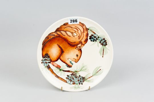 A Moorcroft pottery limited edition (276/500) 1995 year plate, boxed and with certificate, a cream ground plate with tube line decoration depicting a squirrel upon a branch, underglaze impressed and painted marks to the reverse, 8.75 ins (22 cms) diameter