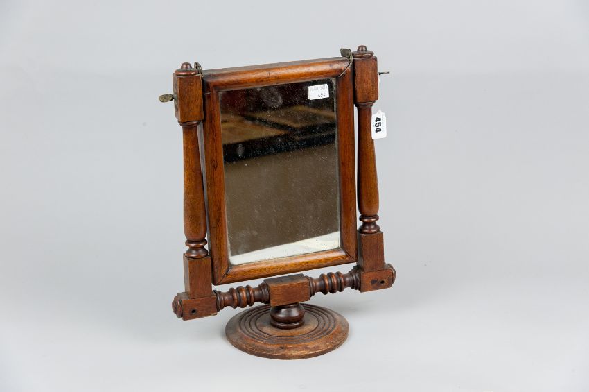 A mahogany turned and block supported gentleman's dressing mirror with metamorphic action for magnifying plate, the sides with brass tighteners standing on a turned wooden base, 15 x 12 ins (38 x 30.5 cms)