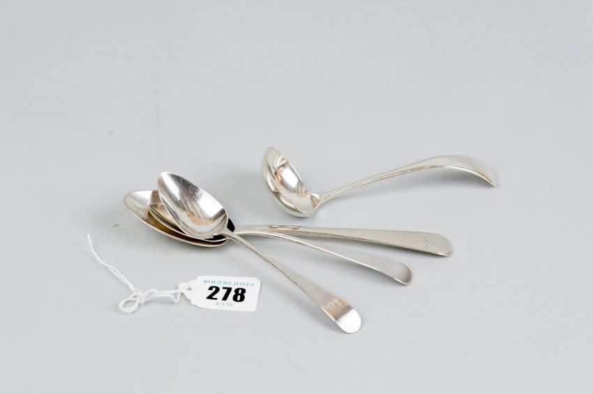 A pair of plain silver teaspoons, 1 oz, London 1802 (damage to bowl of one), a plain silver caddy spoon, 1 oz, Sheffield 1941 and a plain silver dessert spoon, 1 oz, London 1804