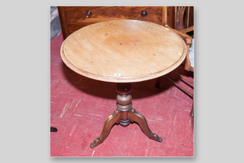 A Georgian mahogany tilt top tripod table with chamfered edge on a carved bulbous support with three splayed legs, 30.5 ins (77.5 cms) diameter the top