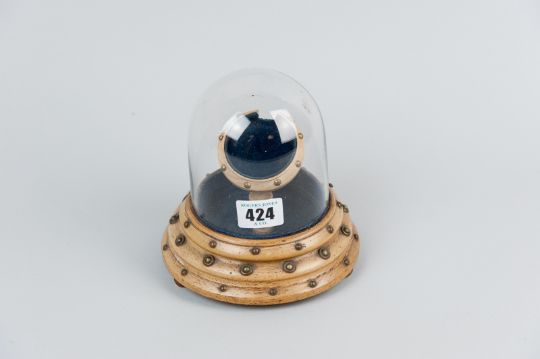 A Victorian oak pocket watch holder with glass dome cover, the turned wood base on bun feet set with brass pins and caps, the hinged domed glass top opening to reveal a capstan style central watch holder, 6 ins (15 cms) high