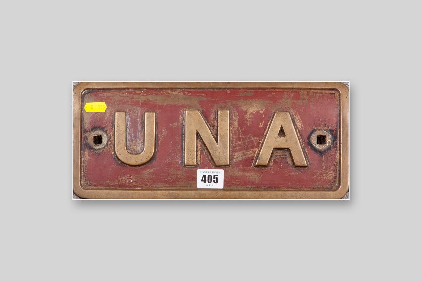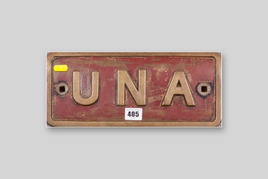 An original bronze engine name plate for 'Una' from Pen-yr-Orsedd Quarry in the Nantlle Valley, this was a 0/4/0 saddle tank built by Hunslet of Leeds, circa 1905 and the engine is preserved today at the Llanberis Slate Museum, the name plate has some presumed original paint still intact (surface scratching and losses obviously), 5.75 x 12.75 ins (14.5 x 32 cms)