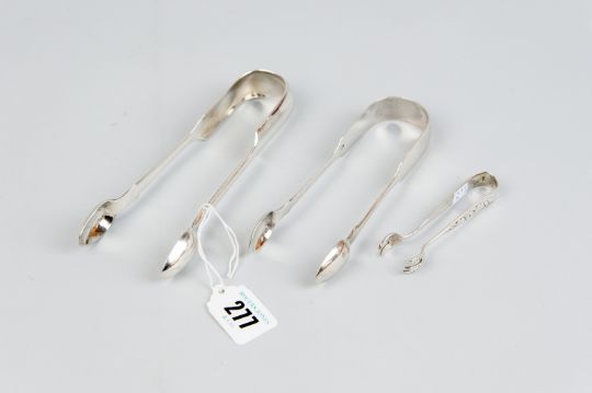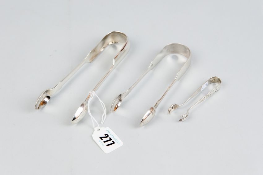 Sugar Tongs - a pair of fiddle patterned sugar tongs, 1 oz, London 1831, a further heavy similar pair, 2 ozs, Exeter date mark indistinct but possibly 1849 and a pair of white metal, believed silver claw sugar nips, 0.3 ozs (parcel of three)