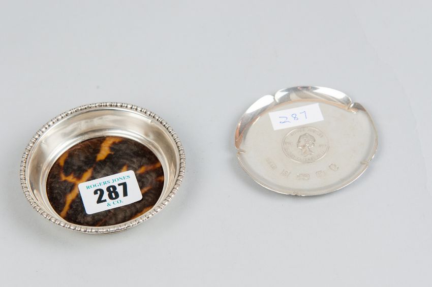 A circular silver and tortoiseshell dish, Birmingham 1923 and a silver 1977 circular Jubilee dish, 0.9 ozs, Birmingham 1977