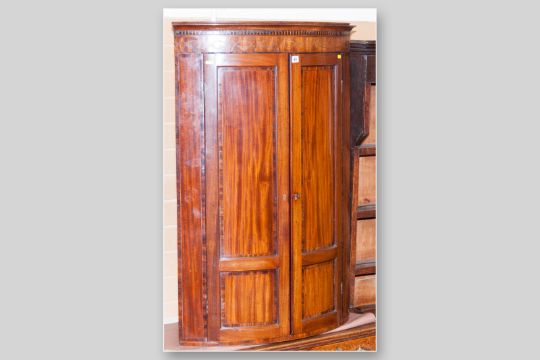 A late Victorian bow fronted two door hanging corner cupboard, the moulded cornice with segmented ebony and mahogany inlay, twin double panel bow front doors opening to reveal a four shelf interior and three small drawers with brass knobs, 45 x 31 ins (114 x 79 cms)