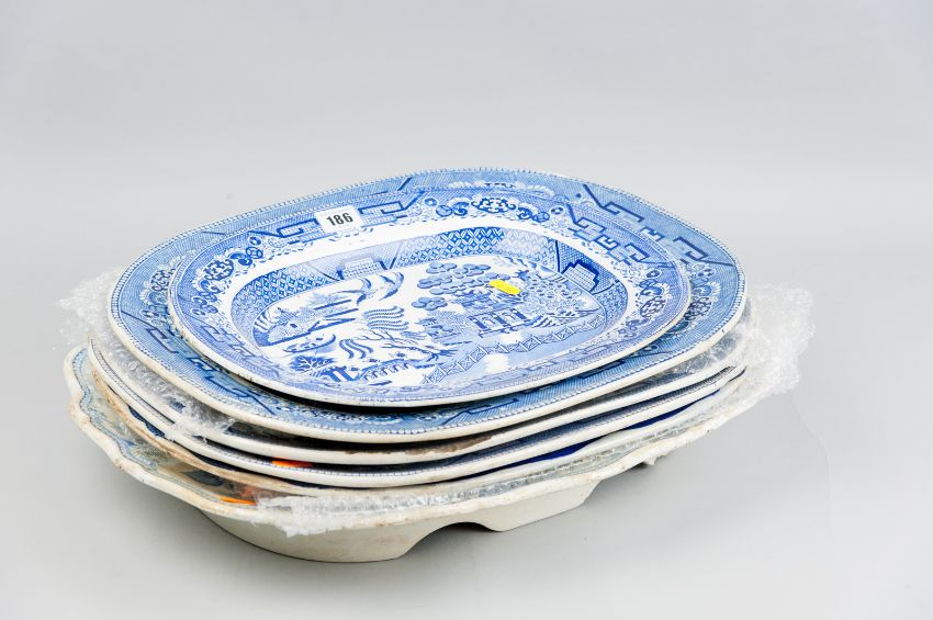 A quantity of blue and white pottery meat platters including a Willow pattern roast platter and an Asiatic Pheasant pattern roast platter, 19.5 ins (49.5 cms) the largest