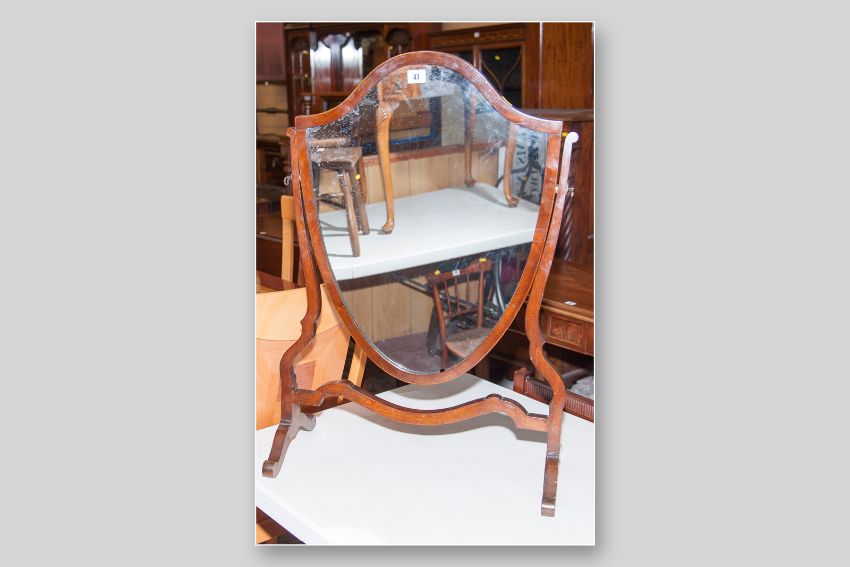 An Edwardian mahogany and boxwood line inlaid shield shaped toilet mirror with shaped stretcher and supports on raised feet, 32 x 22 ins (81.25 x 56 cms)
