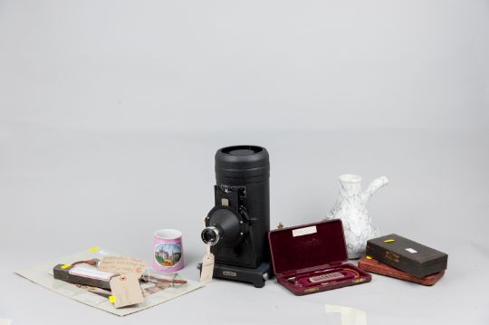A cased Kodak Retina projector, a pottery improved earthenware inhaler, a pink lustre mug with a printed panel scene of Swansea Hospital, three boxed medical instruments, a tin cased Victorian surgeon's tendon knife etc