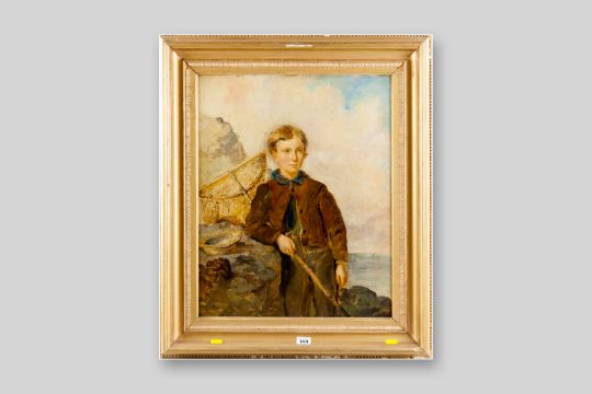R G SWETTING RA (fl 1845-1856) oils on board, a pair - 1. young boy standing by rocks with a shrimping net and 2. young girl with bonnet and basket of fish, each signed and dated 1868, 21 x 17 ins (53 x 43 cms)