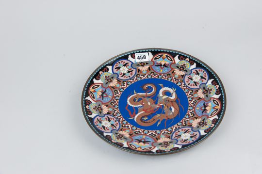 An Oriental cloisonne plate with central swirling dragon decoration on a blue ground and repeating floral pattern border, the underside with all over blue pattern of scales, 11.75 ins (30 cms) diameter (some surface scratches and light crazing)