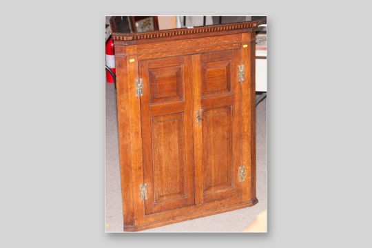 An early 19th Century barrel back oak hanging corner cupboard, a blind frieze above two fielded panel doors with brass 'H' hinges and escutcheon, opening to reveal three wavy edge shelves, 43 x 33 ins (109 x 84 cms)