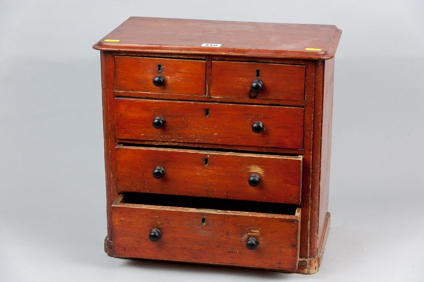 A Victorian scumbled pine chest of two short and three long drawers with brass escutcheons and turned ebony knobs above a plinth base standing on bun feet, 15.5 x 16 ins (39.5 x 41 cms)