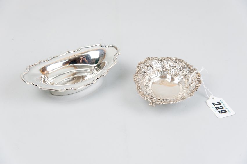 Two silver dishes - an oval plain dish with shaped border, 1.7 ozs, Sheffield 1946 and a heart shaped pierced and scrolled silver ring dish, 0.6 ozs, Birmingham 1928