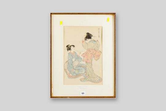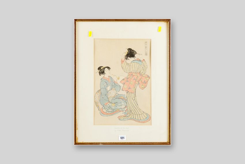 A framed and coloured woodcut print by KITAO SHIGEMASA titled 'Beauties of the East' showing two young girls in decorated robes tending to their hair, label verso for the Fine Adachi Institute of Woodcut Prints, 15 x 10 ins (38 x 25.5 cms)