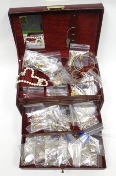 A modern red jewellery box containing a large quantity of modern, mainly 9ct yellow gold fine necklaces, many with small pendants, a quantity of silver and white metal jewellery etc