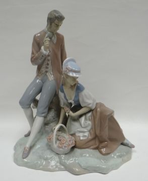 A Lladro model of a Regency courting couple, picking flowers for a basket, on a naturalistic base, 12ins high (31cms)