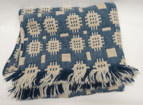 A blue and white patterned traditional Welsh blanket from Solva Woollen Mill