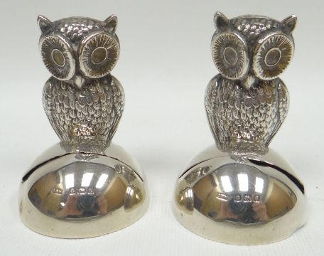 A pair of silver menu holders in the form of perched owls, feather decorated and upon semi-globular bases, Birmingham 1906 (glass eyes missing), 1.4ozs