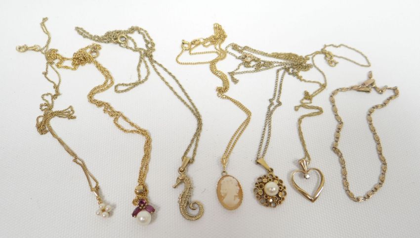 Seven various fine necklaces and mixed-form pendants, mainly if not all 9ct yellow gold 12.8gms gross