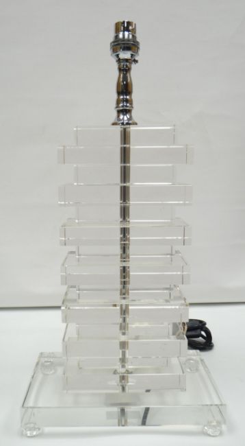 A contemporary clear perspex and chrome table lamp of cubist form and raised on four ball-feet, 17.5ins high excl. shade (44cms)