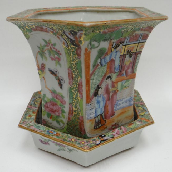 A nineteenth century Canton famille-rose hexagonal planter and matching dish, typically decorated all round and with two panels of figures in a garden and two panels of flora and fauna, 7ins high (18cms)