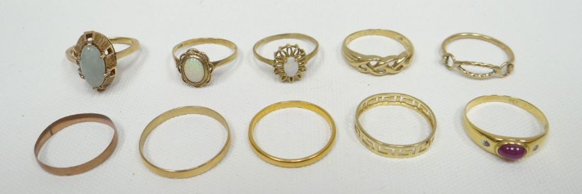 Ten mixed mainly 9ct yellow gold rings, 17gms total