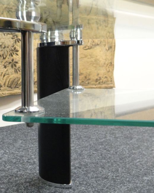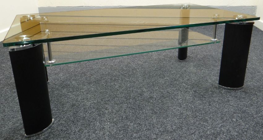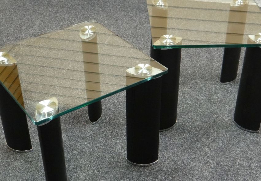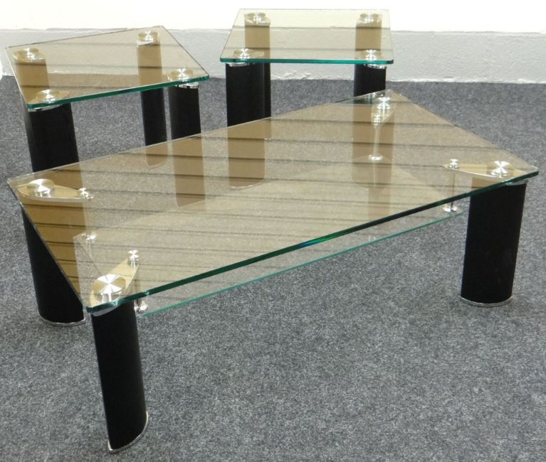 A suite of three contemporary glass topped tables, comprising lower long-john coffee table and two square higher versions
