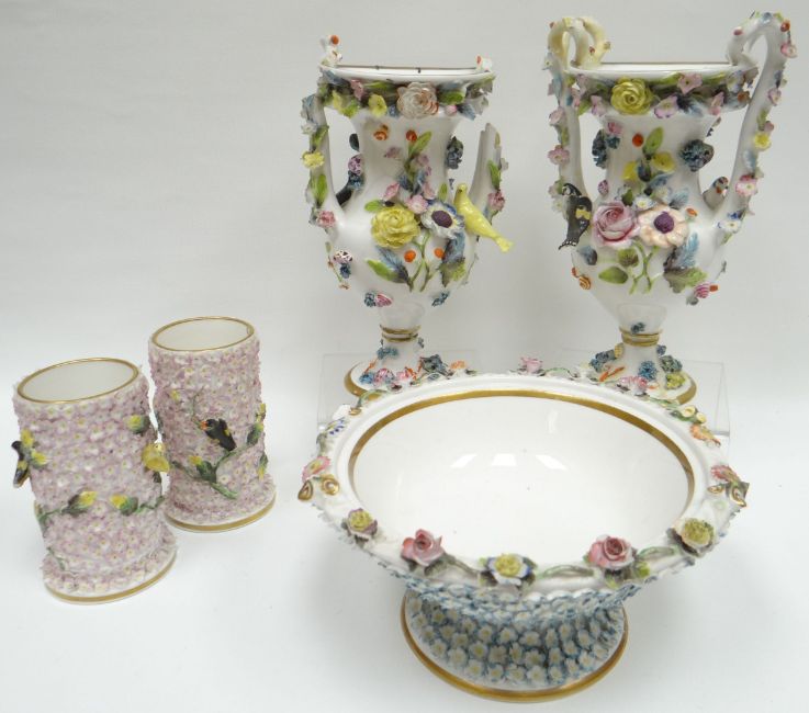 A pair of Spode chimney-vases, floral and bird encrusted with pink flowers and canaries (chipped tails), 4ins high (10cms) with similarly decorated Spode sugar basin (no cover); together with a pair of Spode Felspar Porcelain floral and bird encrusted twin-handled vases (extensive damage / repair), 7ins high (18cms)