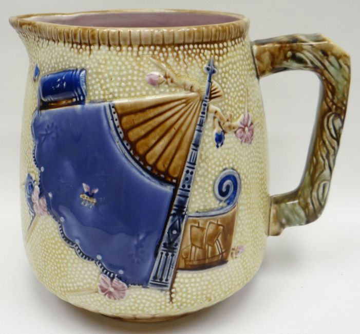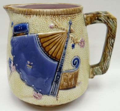 A Staffordshire majolica jug decorated in the Chinese taste with fan, 8ins high (20cms)