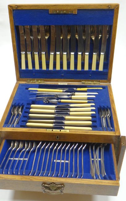 An extensive and complete oak canteen of Walker & Hall cutlery, the canteen with two drawers below hinged case and for a twelve place setting