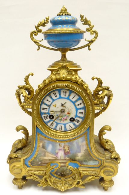 A late nineteenth century gilt-metal and painted Sevres porcelain mantel clock of Rococo form and having a Romantic painted vignette below the circular dial and with urn-finial, Japy Freres movement, 14ins high (36cms)