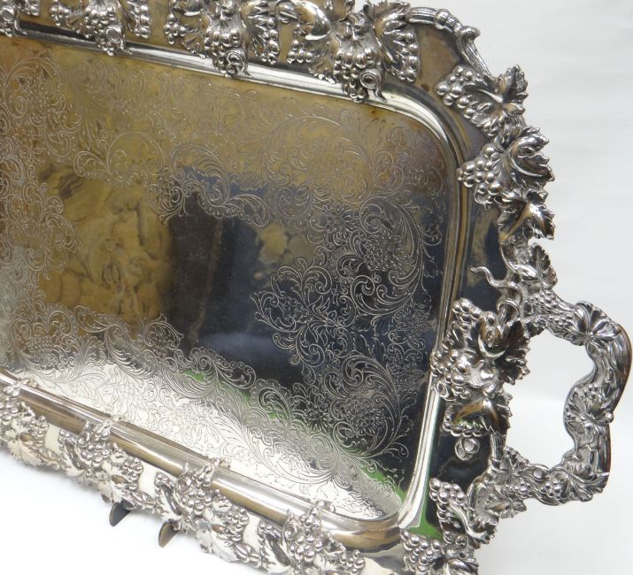 An impressive EPNS twin-handled tray having fruit-on-vine border, handle and raised on four fruit-on-vine feet, 29ins long (74cms)