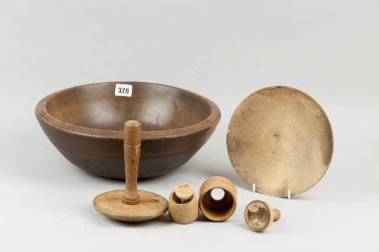 A group of treen items incl. an early nineteenth century sycamore dairy bowl with ring banding, 11 cms high x 34 cms diameter, a shallow dish, a 13 cm mushroom shaped implement and two butter stamps