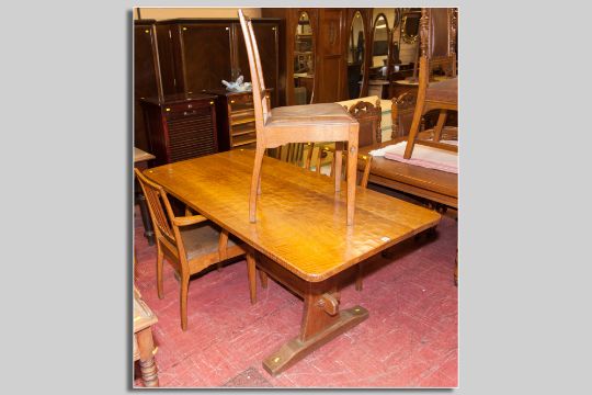 A set of four (three plus one diner) spindlebacked oak chairs with acorn motif by Alan Granger of Brandsby, York and an oblong refectory dining table with end pillar supports, 168 x 84 cms