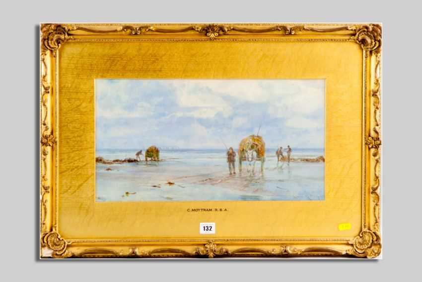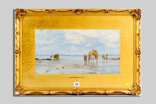CHARLES MOTTRAM watercolour - coastal scene with seaweed gatherers and their horses and carts, signed and dated 1882, 25 x 46 cms