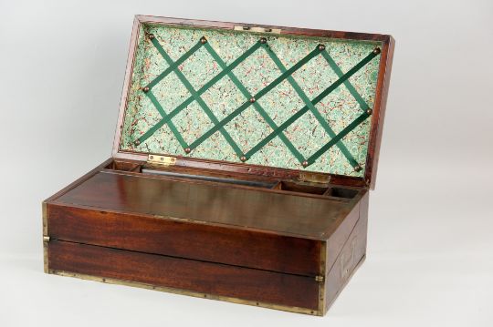 A nineteenth century mahogany and brass bound lap desk with double-hinged lid and slope with insert brass carrying handles, brass name plate and escutcheon, 16 x 46 cms