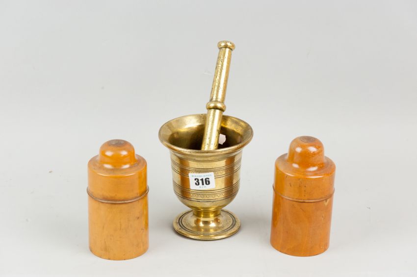 A late eighteenth century brass pestle and mortar and a pair of boxwood apothecary bottle holders, the latter 14 cms in height