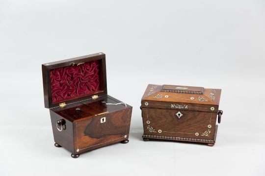 A Victorian rosewood and mother of pearl inlaid sarcophagus shaped tea caddy with carved wooden ring carry handles standing on turned bun feet, the interior with twin lidded compartments, 14 x 24 cms along with a similar two compartment tea caddy, 15 x 22 cms