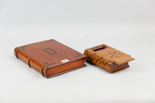A Victorian mahogany book shaped box with carved spine and ebony inlay, re-lined satin interior with key, 29.5 x 23 cms along with an oak book shaped box, the slide-off lid with starburst multi-wood inlay and lattice inlaid spine with re-lined satin interior, 19 x 13 cms