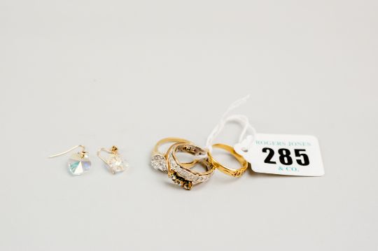 Four sundry 9ct dress rings and a pair of crystal style earrings, 9 gms gross