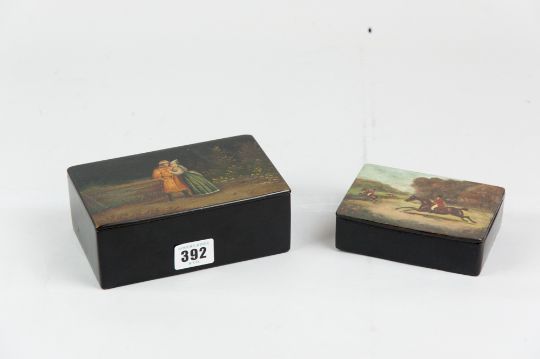 A nineteenth century papier mache box, the hinged lid hand-painted with a horse-riding scene, 12 cms across, and a slightly later Russian papier mache box, the lid decorated with a courting couple, 15.5 cms across