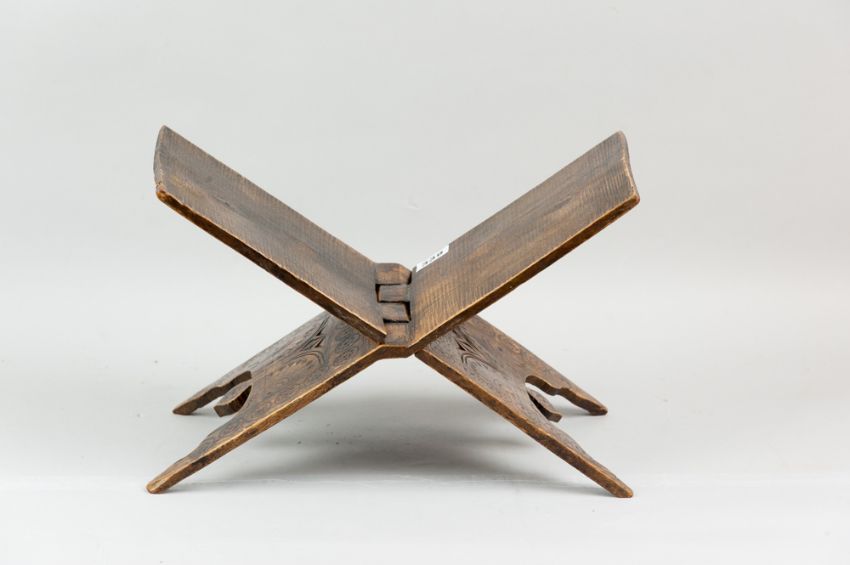 A Middle Eastern antique folding Koran or book stand, the carved exterior with Eastern designs and patterns, 44 x 19 cms when folded with integral carved hinge