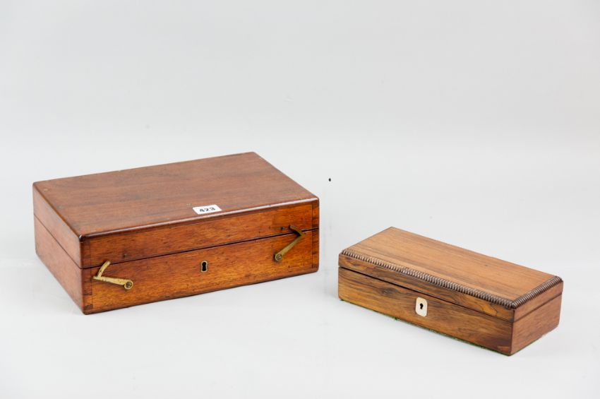 A Victorian mahogany watch box with swing brass closing hooks, re-lined leather interior with suede pads, 10 x 31 cms and a small Regency rosewood lidded sewing box with multi-section interior, 7 x 25 cms