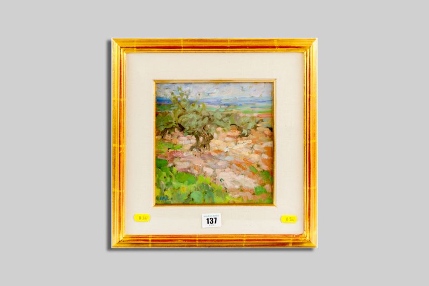 DIANA ARMFIELD oil on board - olives in a Spanish landscape, signed with initials and with title label verso, 19.5 x 18.5 cms