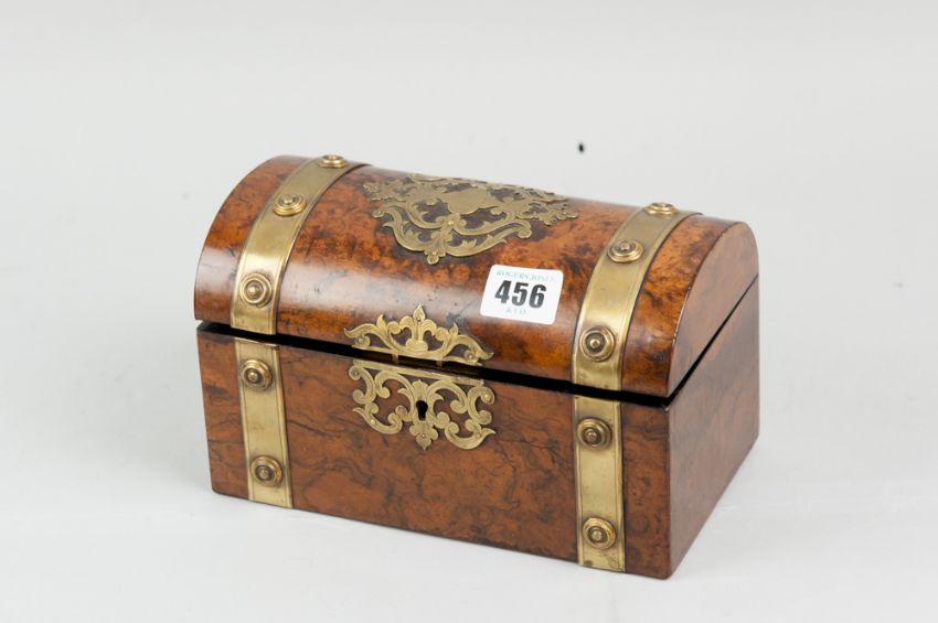 A 19th Century casket shaped figured walnut tea caddy with pierced brass embellishments and escutcheon and brass button capped banding, the domed lid with red satin interior, twin tea compartment lids with ebony knobs (possibly replaced), 12.5 x 20.5 cms