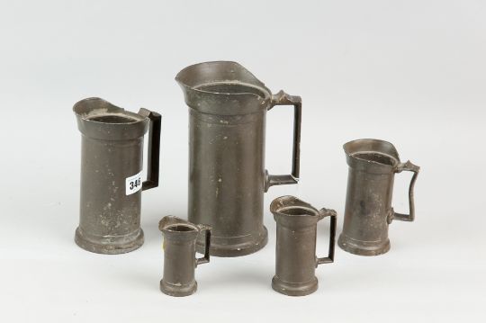 A set of five French cast pewter style measures of tankard form, marked 'Litre', 'Demi-Litre', 'Double Deci-Litre', 'Deci-Litre' and 'Demi Deci-Litre', 20.5 cms the tallest, impressed flower mark to the base with the letters 'D J K'