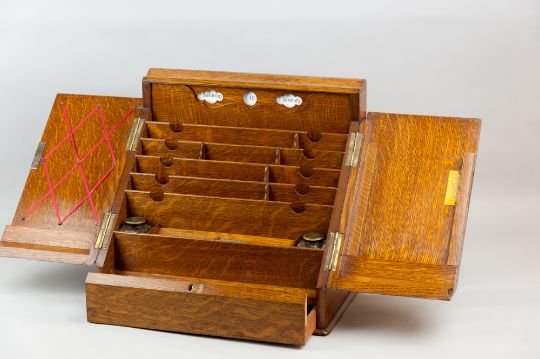 A well-fitted golden oak stationery cabinet, twin opening doors and sliding bottom drawer, hinged top rail with decorative calendar display, 33 x 37 cms