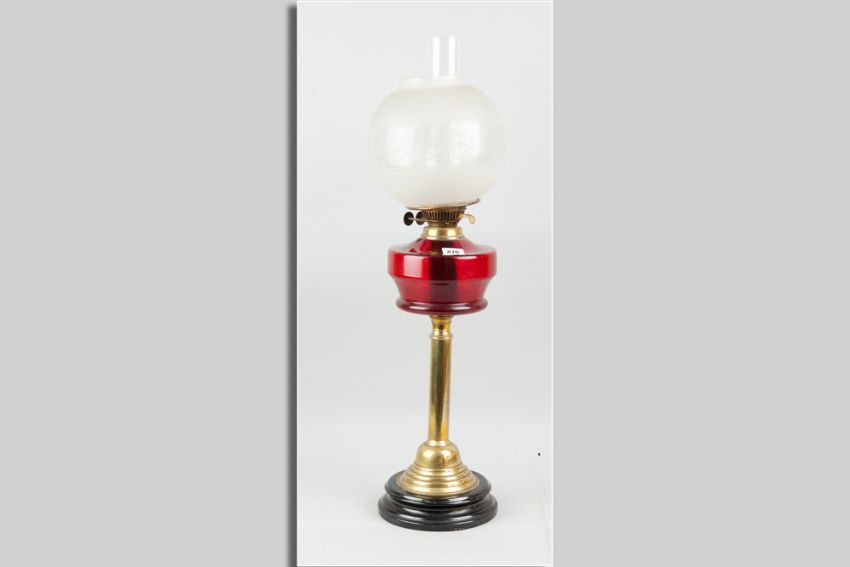 A brass based oil lamp with cranberry glass reservoir and etched bowl shade