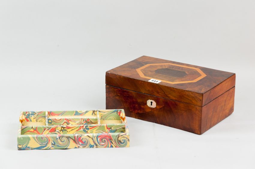 A 19th Century walnut and mahogany jewellery box with segmented walnut and satinwood veneered top, the interior with satin and paper re-lining and multi-section lift-out tray, with key, 12 x 31 cms