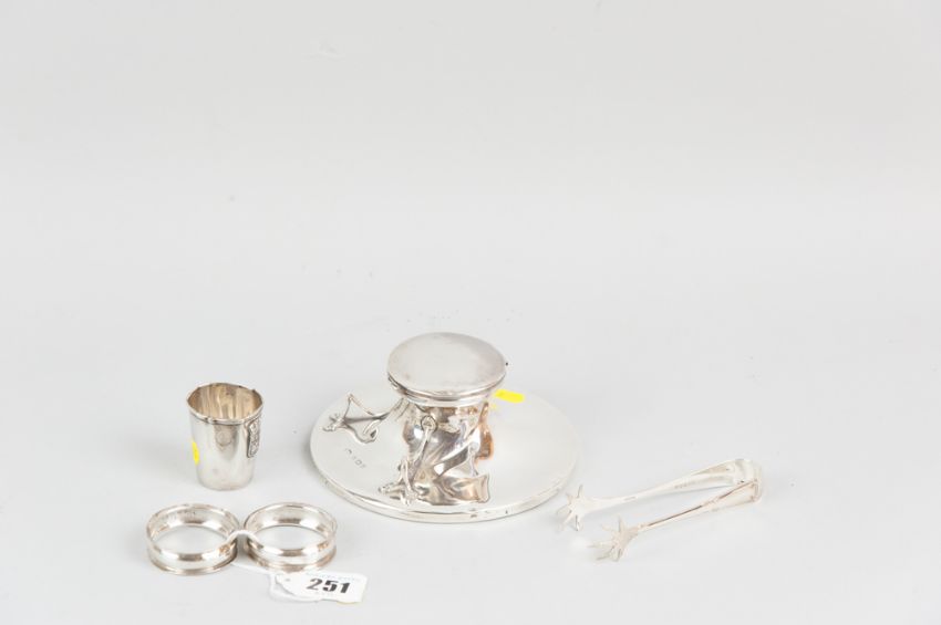 A circular silver inkwell, Birmingham 1905 (hinged lid damaged and impact damage to body), a pair of narrow silver napkin rings, a silver spirit cup with Rouen coat of arms and a pair of silver claw sugar nips